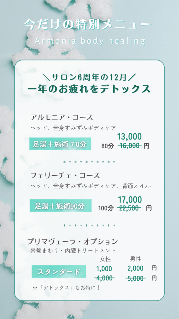 ゆっくり体を整えたい方も、久しぶりに受けてみようかな…という方も、この機会にぜひどうぞ。