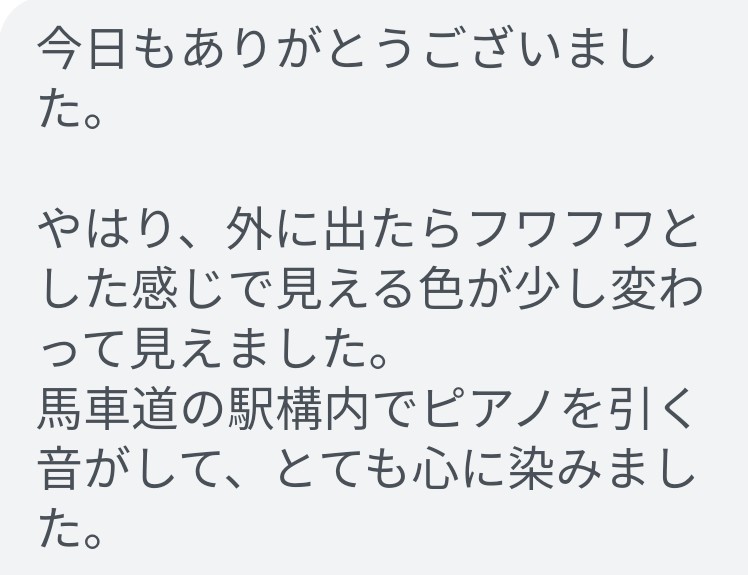そして、都内に戻りましたら次はマッサージしながらのヒーリングを受けにお店に伺います。ありがとうございました。