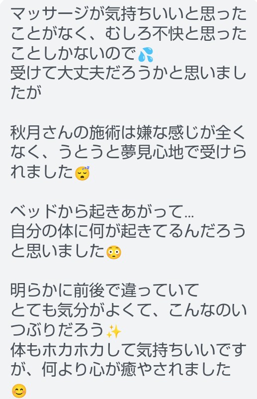 マッサージして下さる秋月さんの手も言葉も温かくて。身体がどんどん緩んで温かくなって。