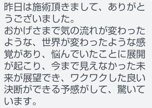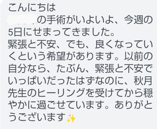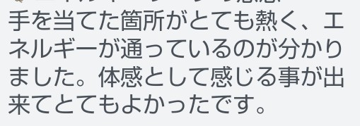 迷いや期待を抱え、メンタルが安定していないのですが、ヒーリングを受けると心と体が温かくなり気持ちが楽になって「大丈夫、できる」と思うことができました。
