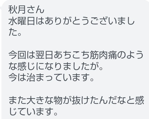 秋月さんの対面の施術は時々受けてますが、リモートは初めてでした。気軽にメンテナンスできるのでリモートが合ってると思いました。
