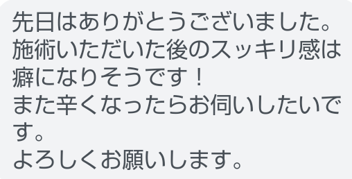 鎮痛剤注射後も、同様に痛みと痺れが消失するので施術の経過をみていましたが、1ヶ月後も半年後も痛みが出現することなく…施術の効果を心から実感した次第です。あれほど病院や整体に通院していた日々が嘘のようです。