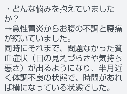 マッサージなど体のメンテナンスでは整わない部分を整えていたただいて、嫌な不調から解放されました。